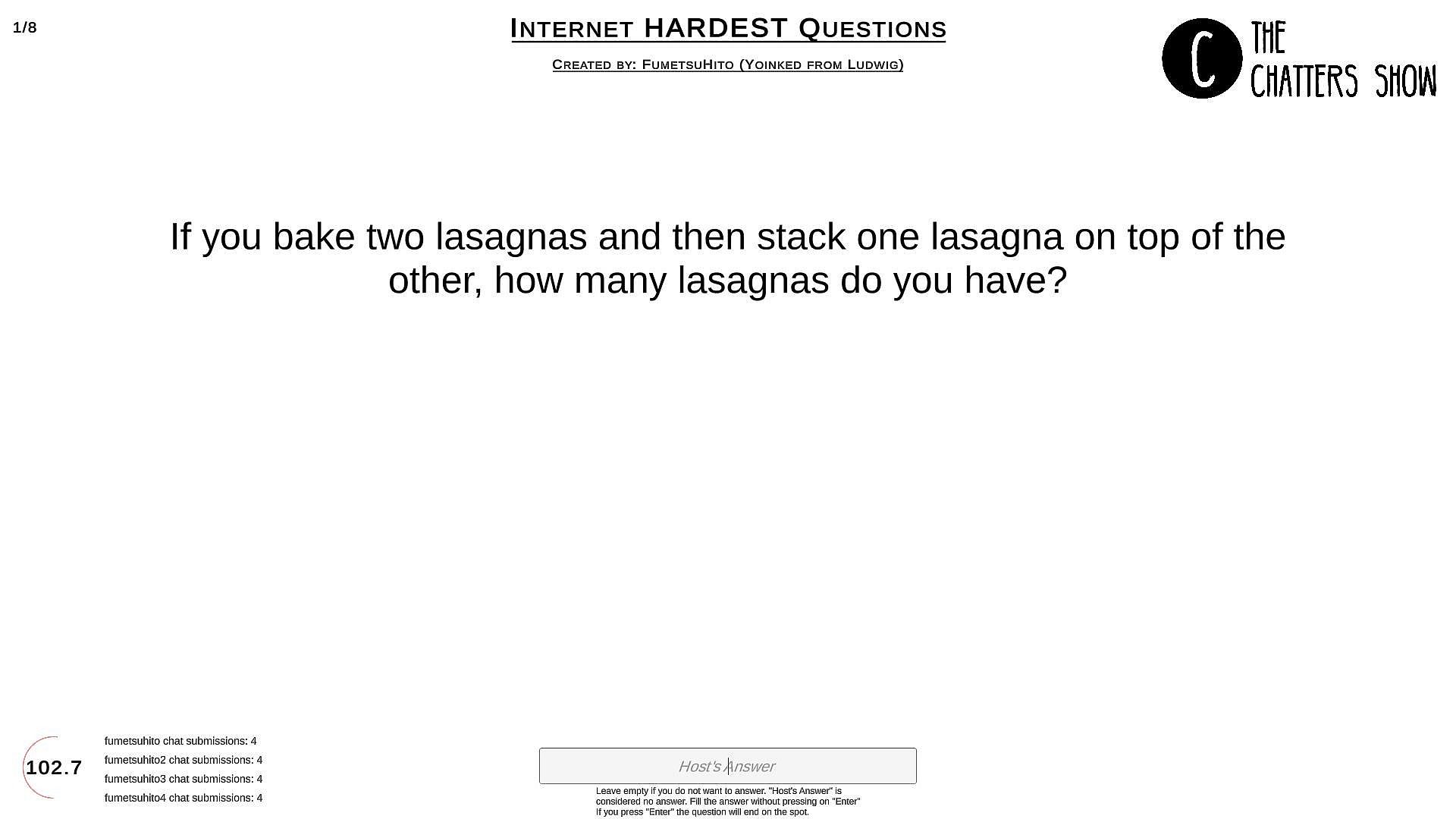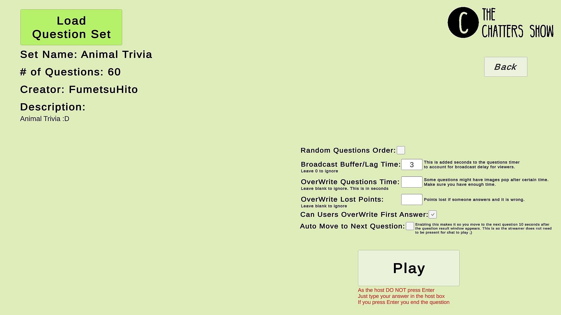 The Chatters Show Free Version is designed for members of the community to create and edit question sets for their favorite Twitch streamers to play using the paid version of the game. Create questions sets for free and share with your community.