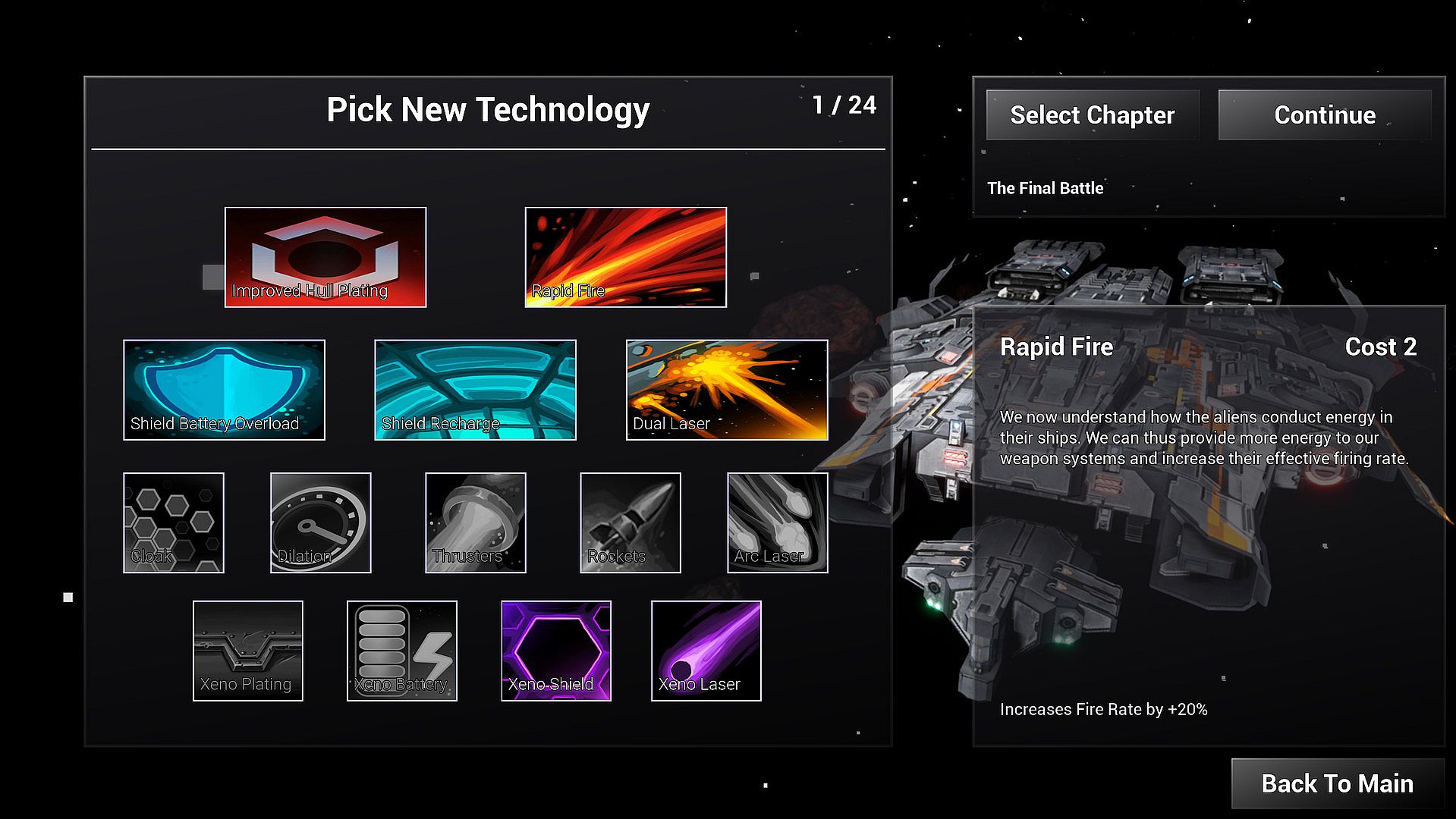 54 Skill Points wait to be spent on alien technology to improve your ship. With every level completed you will get more skill points (depending on difficulty) which you can then spent to make your ship more powerful. You will need them to beat the game on the hard or extraterrestrira setting, so spend them wisely.