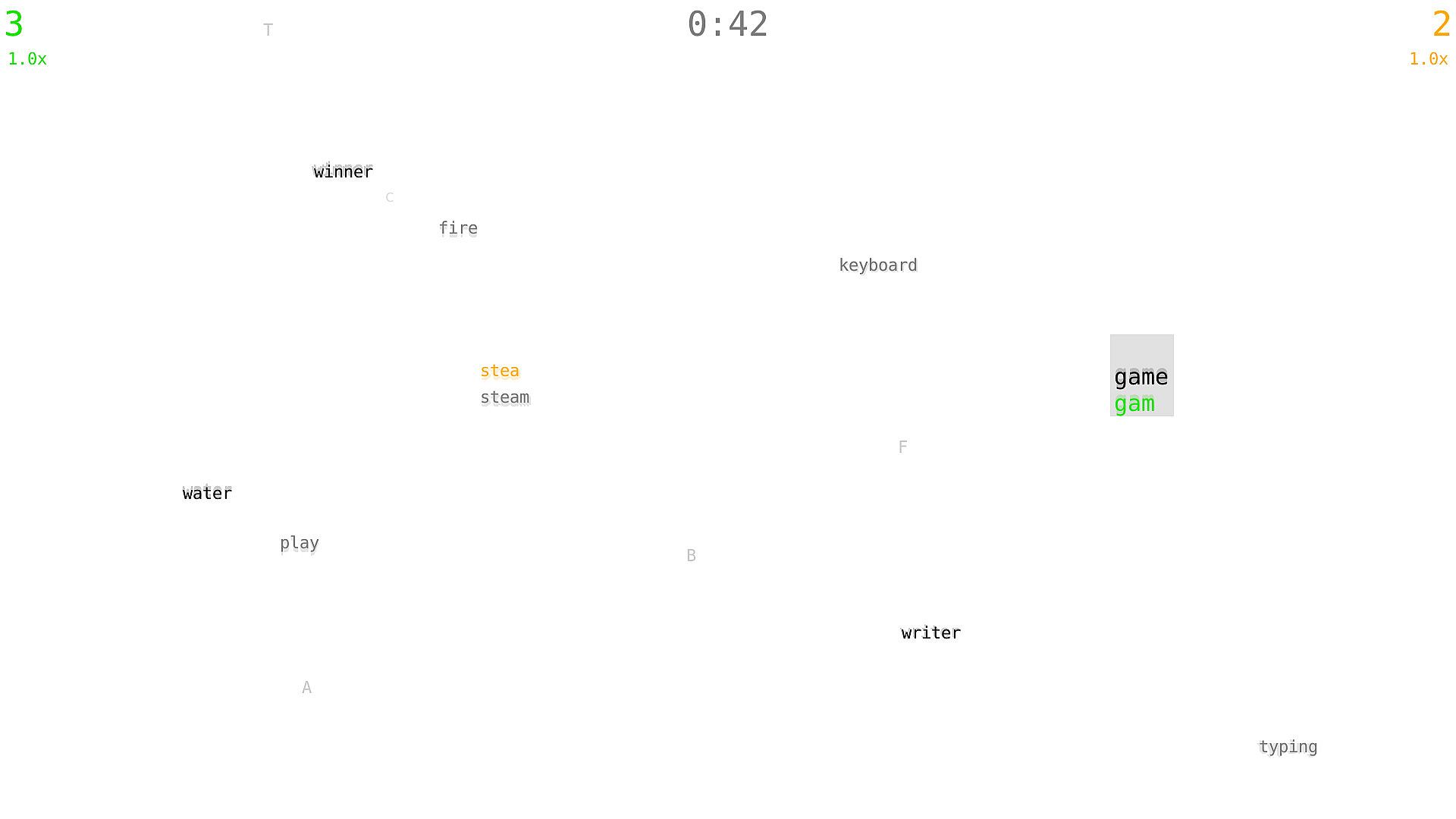 Typefighters is a competitive multiplayer game where two players battle each other using their typing skills. Its variety of modes does not only emphasise typing speed and correctness, but also other skills like reaction time, sustained attention, creativity, tactics and anticipating the opponents moves. Aside from being a tool to settle arguments on who is the best on a keyboard, the game can also be used for training purposes.