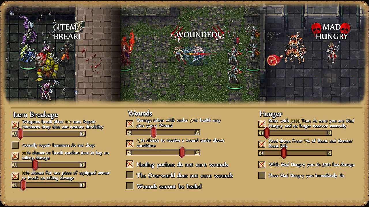 Crush more monsters, get less loot, and discover all new ways to end up as bloody Triger Chow! Die of starvation, suffer crippling wounds, and watch your gear crumble into broken shards! Over 100 fine tuned difficulty options to challenge yourself, with new Leaderboards so you can dunk on your chump friends.