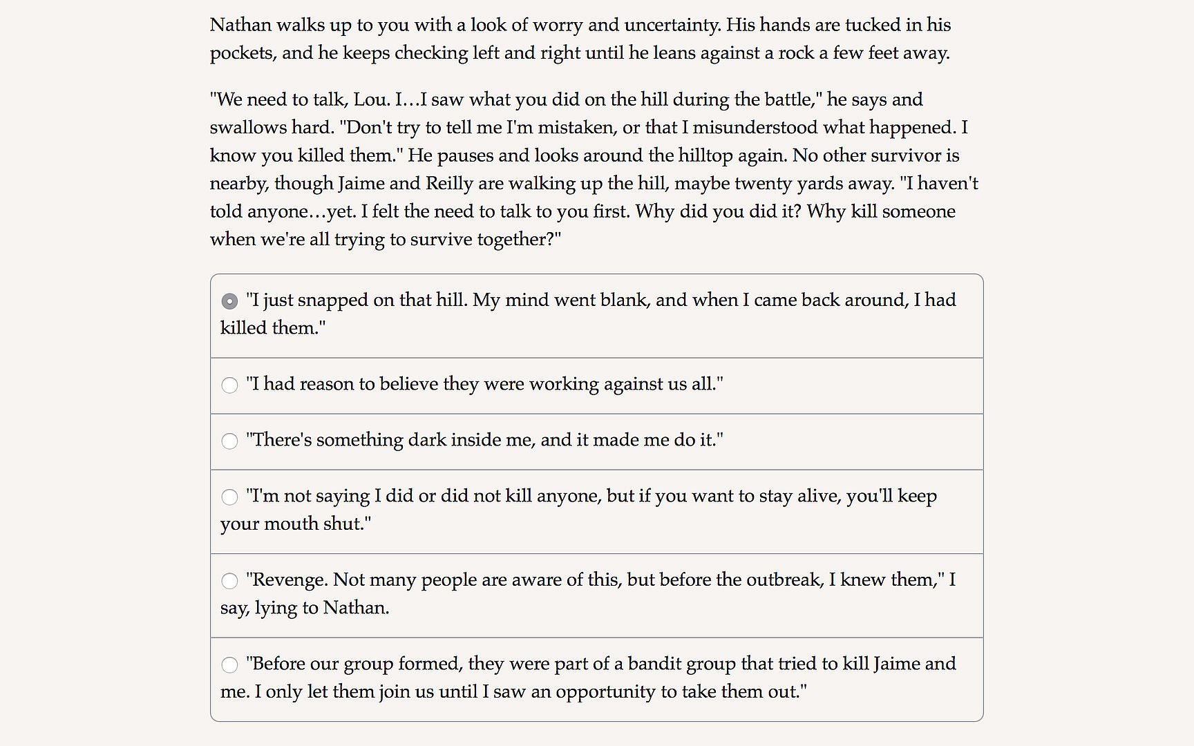 Zombie Exodus: Safe Haven: Part Two continues your story as you escape Nightfall with your new group of survivors in search of a safe haven. Continue your story from part one, or skip right to the new chapters with a new character!
